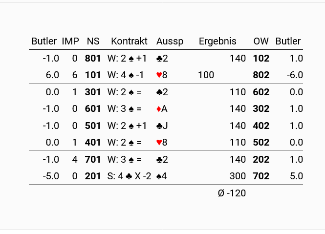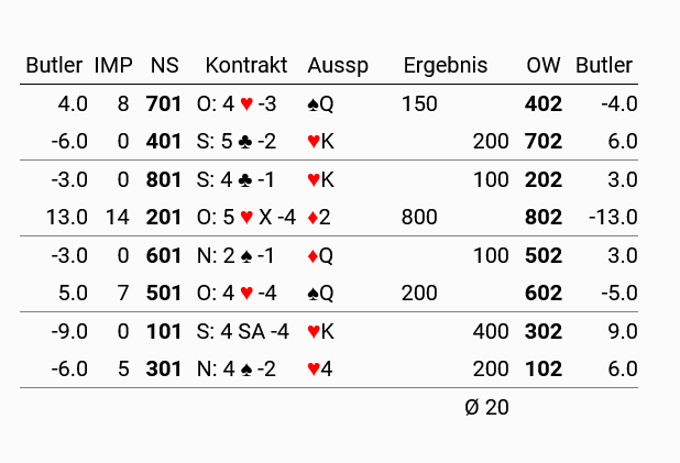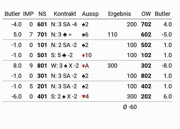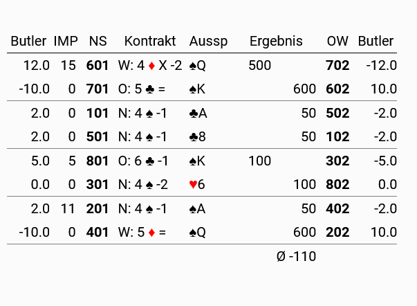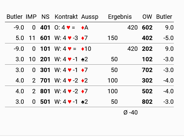 West und Nord ( = ich glaube nicht an 4 Coeur) passten, Ost kontrierte noch einmal auf ( = Vertreibung aus dem Paradies), West bot mit guter Laune 3 Pik, Nord glaubte jetzt doch plötzlich an 4 Coeur und bot diese, mir blieb gar nichts anderes übrig als diese im Paarturnier zu kontrieren ( = 3 Pik erfüllt sind 140, 4 Coeur unkontriert minus 1 sind nur 100).