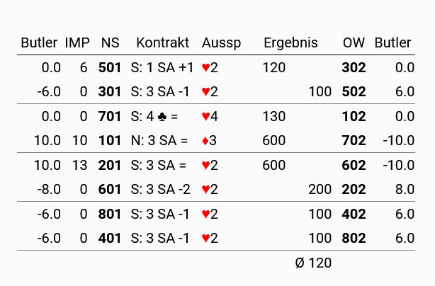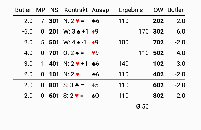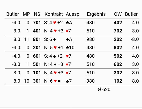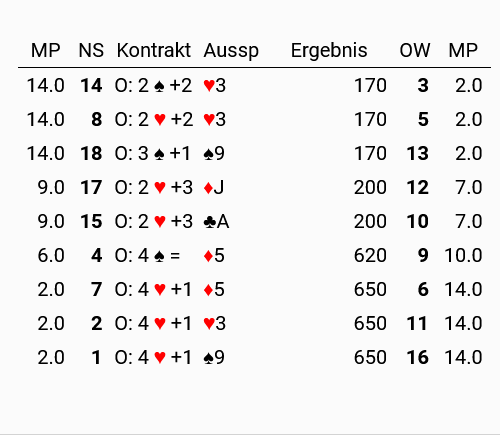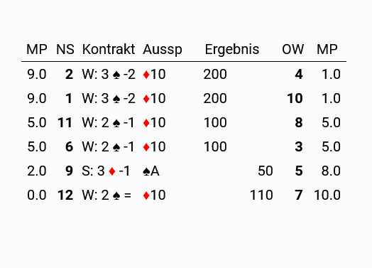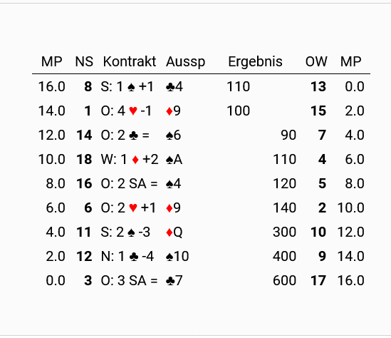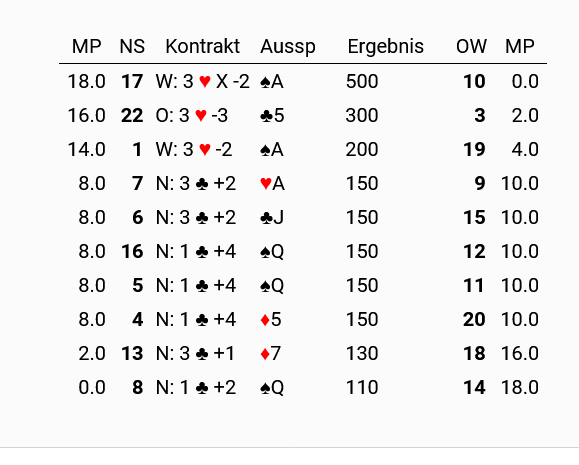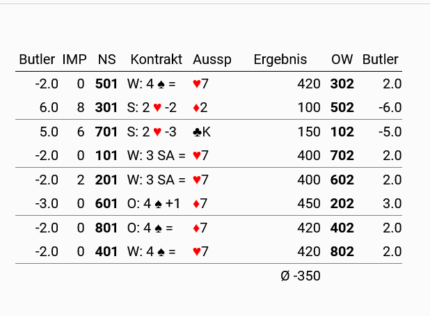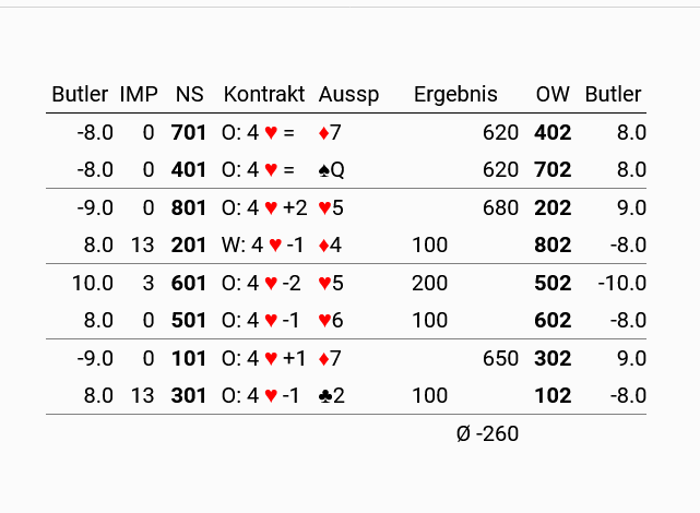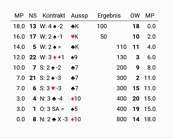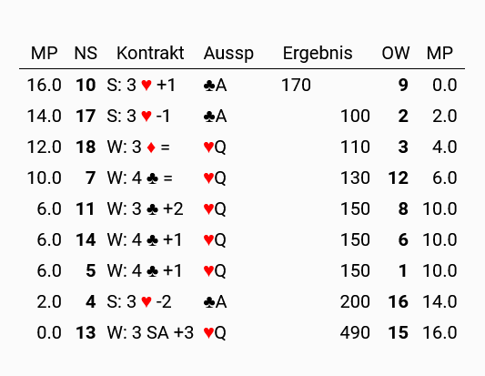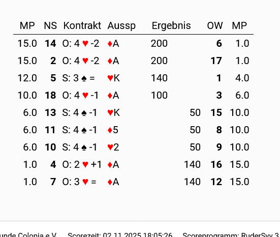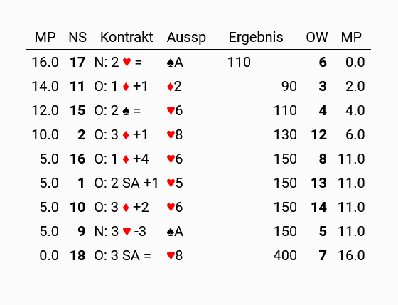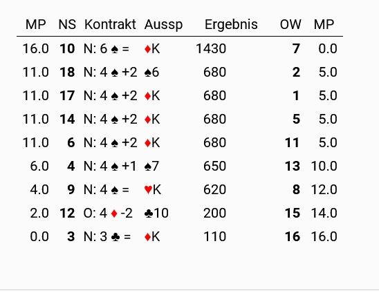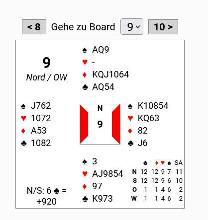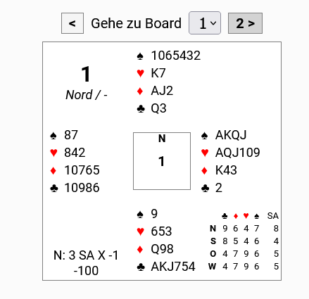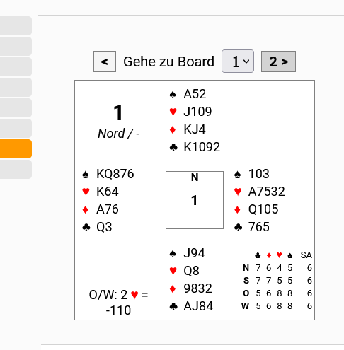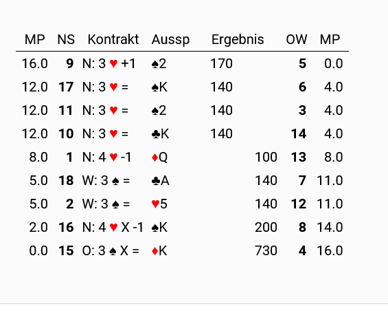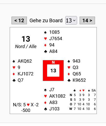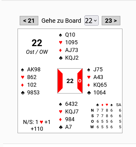 Nord spürte einerseits jetzt ein Unwohlsein bei Süd ( = leider kennt man sich halt, da läßt sich das manchmal kaum vermeiden), andererseits ist er ein Paarturnierhai und weis, dass 2 Coeur mehr zählen als 2 Karo.