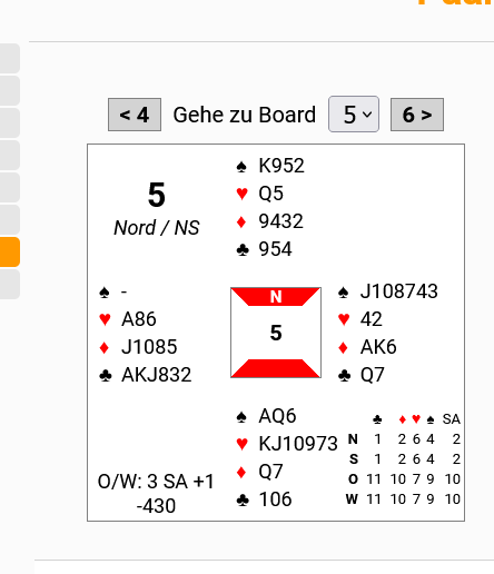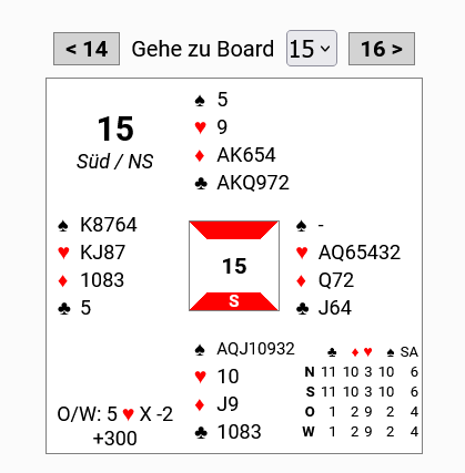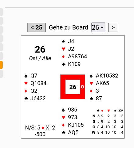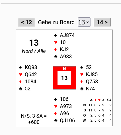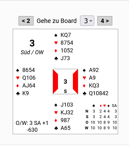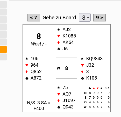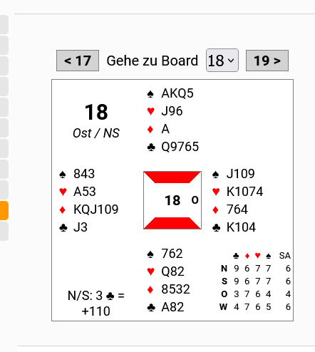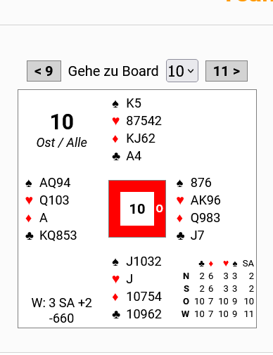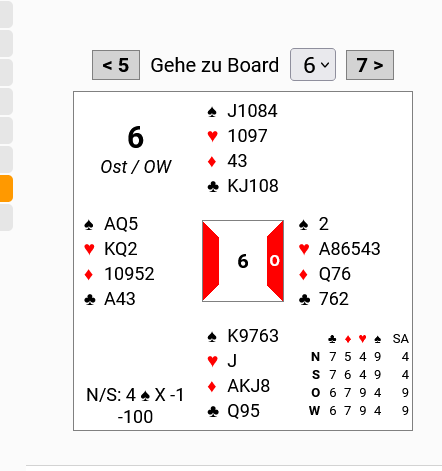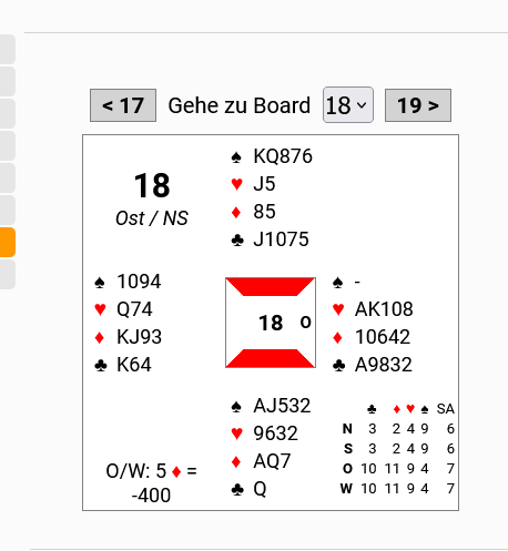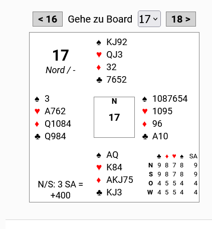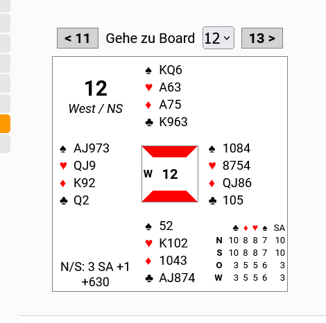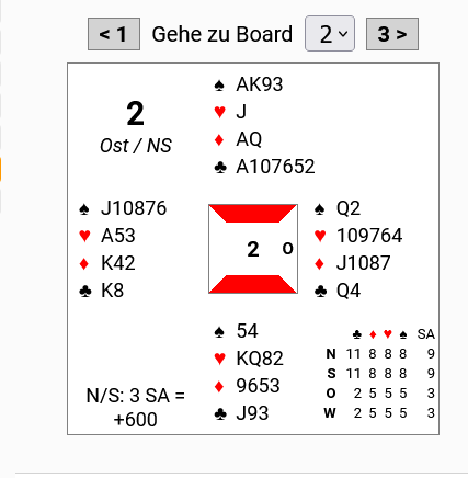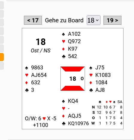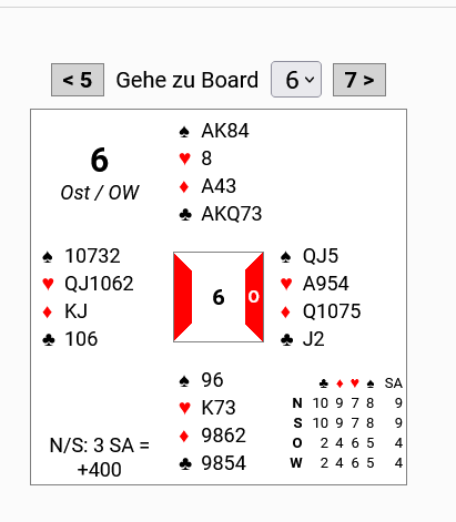 Ich bin mir sicher, dass ich auf Ost in Treff Ass, Bube, 8 UND 3 hatte, West war in Treff Chicane, hatte dafür meine Coeur 3, d.h. Coeur und Treff 3 waren vertauscht.Sigrun und Bronek werden dies bestätigen können.