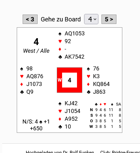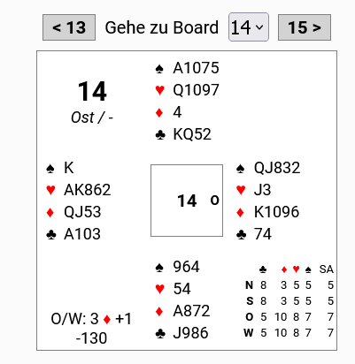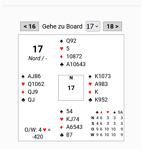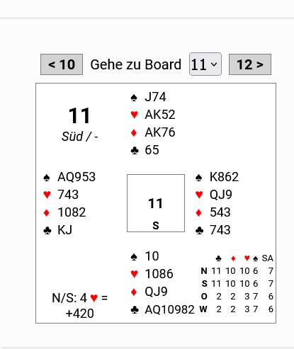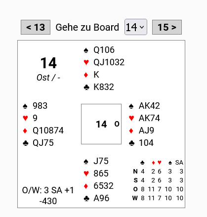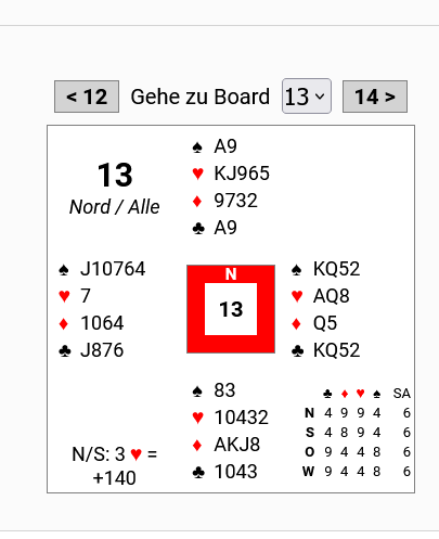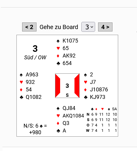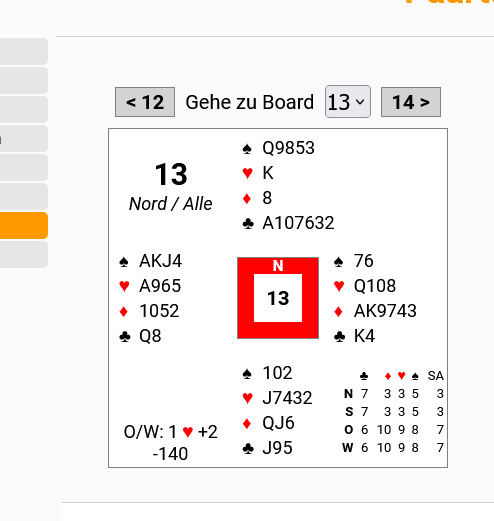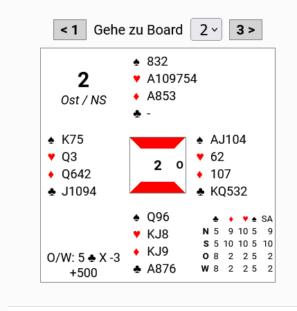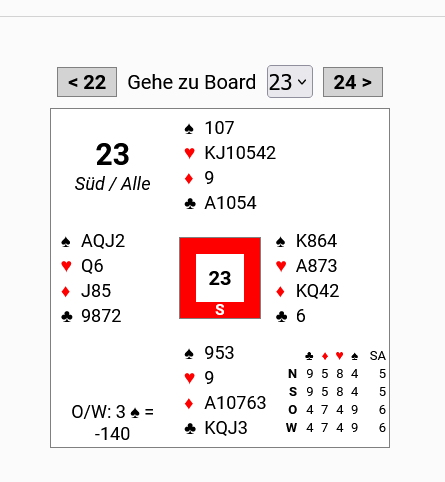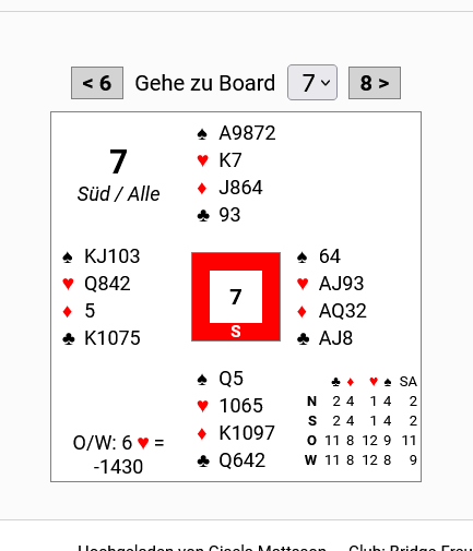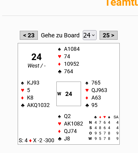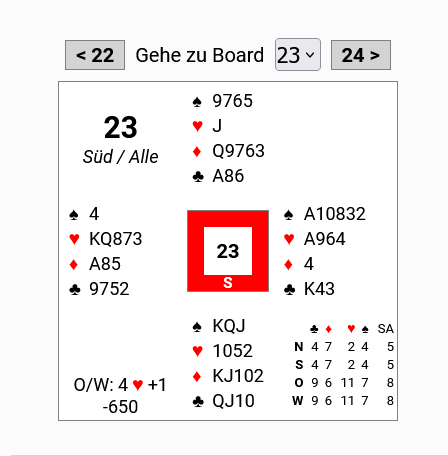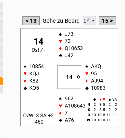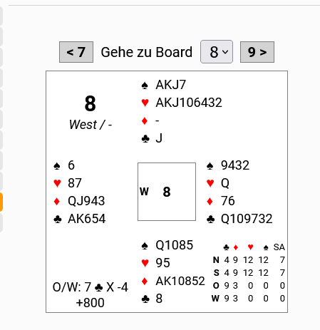 Ich bin mir sicher, dass ich auf Ost in Treff Ass, Bube, 8 UND 3 hatte, West war in Treff Chicane, hatte dafür meine Coeur 3, d.h. Coeur und Treff 3 waren vertauscht.Sigrun und Bronek werden dies bestätigen können.