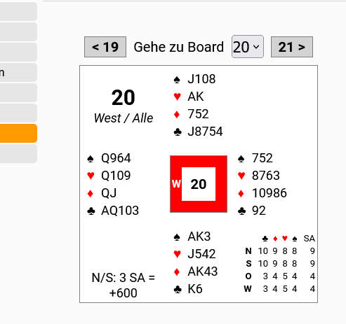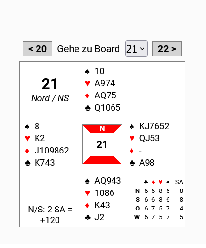 Wie Sie dem Ergebnisdiagramm entnehmen können, gehen 3 SA nur von West ( = wo man niemals reinkommt), von Ost fallen sie Double Dummy, in der Parxis werden sie her erfüllt werden, wie auch durch Paar 19 bei uns.