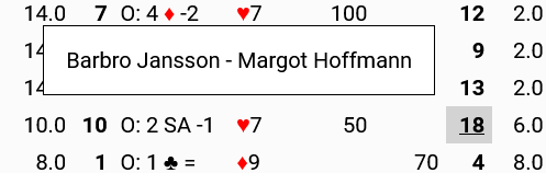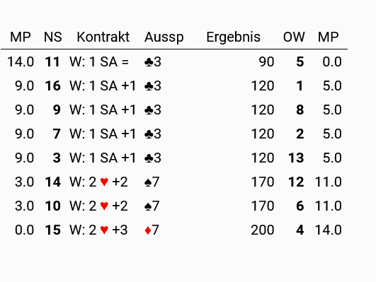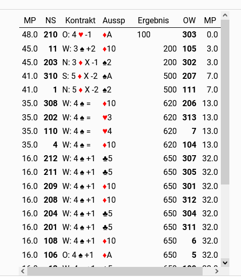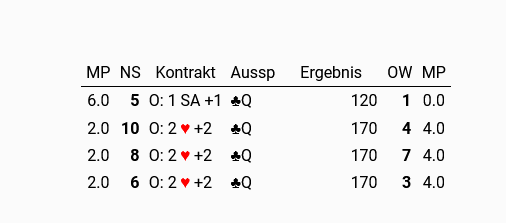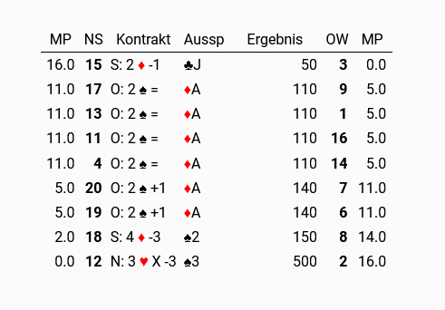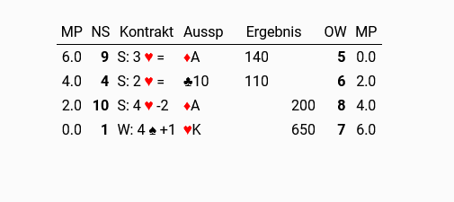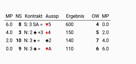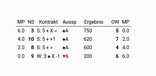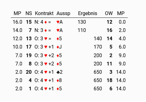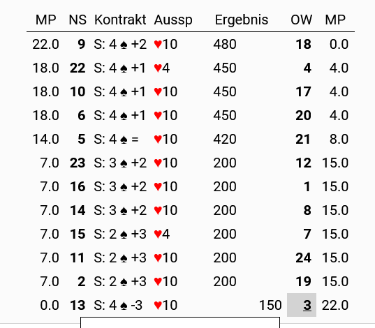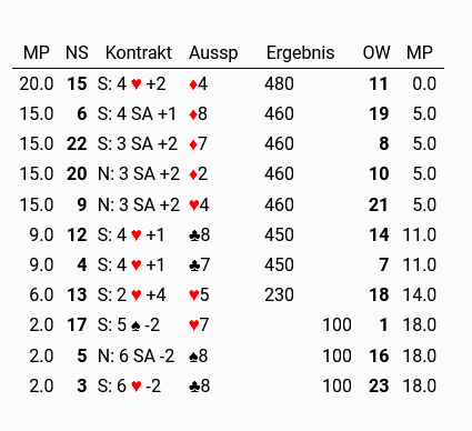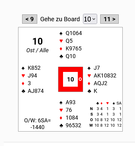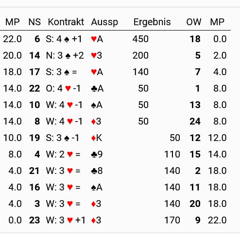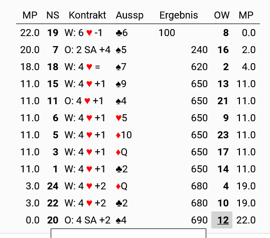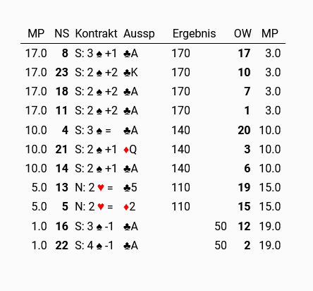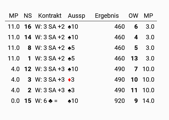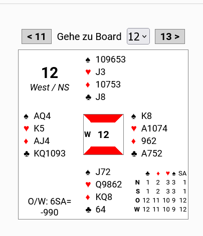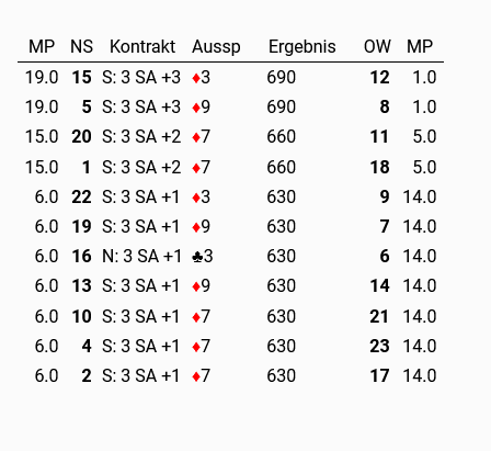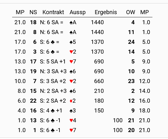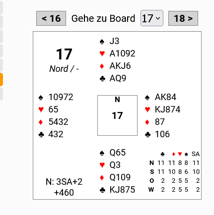 Damit haben N/S den Topkontrakt erreicht, 3 SA gehen wegen der Treffhaltung nur von Nord, nicht von Süd, was alle 3 Paare bei uns falsch machten.