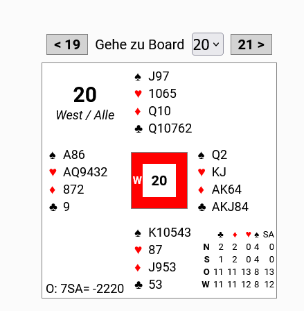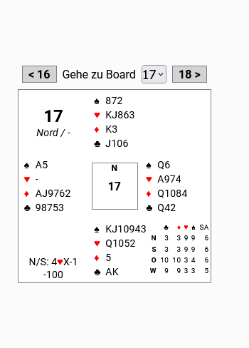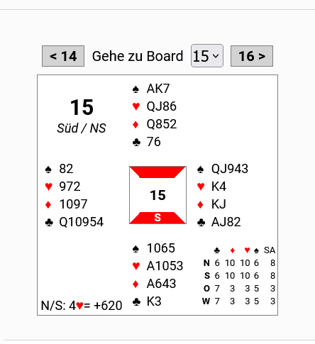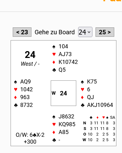 Ost wiederum wird mit seinen 15 FP von West mit mindestens 11 Punkten eingeladen, 15 + 11 sind bei mir 26, mit Stoppern in allen Farben fällt mir da außer 3 SA nicht fiel ein, eigentlich GENAU GAR NICHTS.