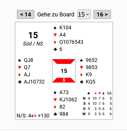 Sorgen macht ihm doch letztlich nur die Double Dame in Karo, die Wahrscheinlichkeit, dass sein Partner für sein 5 Coeur eine der beiden Karo Hochfiguren hat sehe ich bei über 50%.