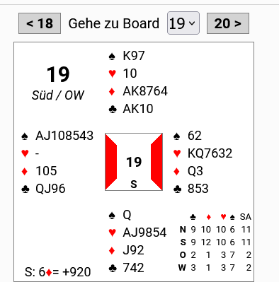 Lassen Sie sich nicht kirre machen von der Double Dummy Analyse, es gehen 13 Stiche, ich kenne keinen guten Spieler, der hier in Karo und Treff schneidet, 6 Coeur ist der beste Kontrakt in der Praxis gefolgt von 6 SA.