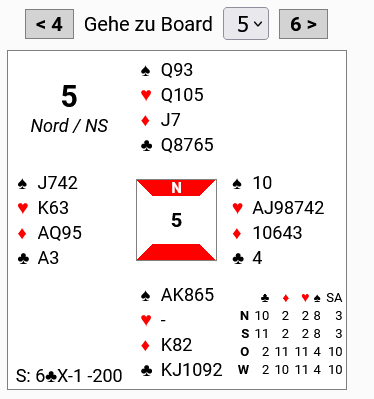 Auf die 6 Treffs bedient Nord einmal und wirft 1 Pik und 4 Karos ab, dann realisieren N/S die 4 OF Hochkarten und einen entwickelten Karolängenstich.